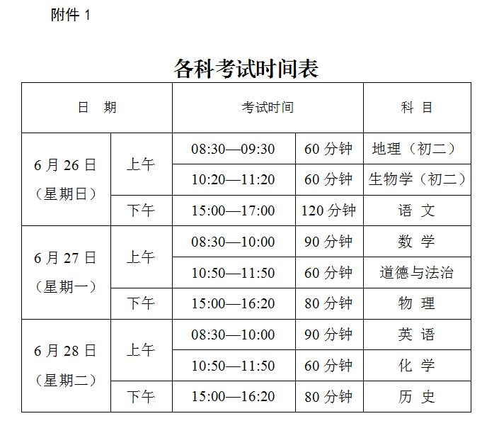 考试时间:八年级地理、生物学各60分钟、生物实验操作10分钟,九年级语文120分钟,数学、英语各90分钟,物理、历史各80分钟,化学、道德与法治各60分钟。