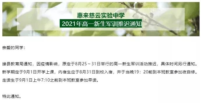 原定于8月25日—31日举行的高一新生军训活动推迟,时间另行通知。