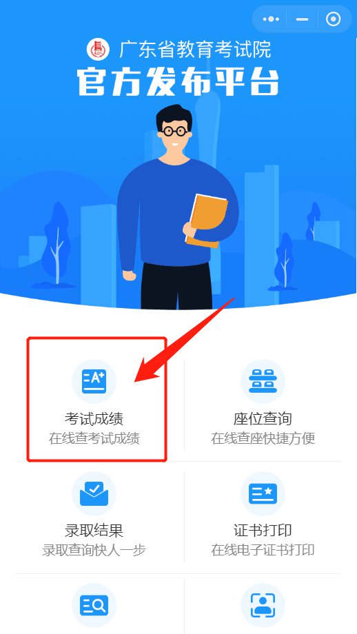 1.进入“广东省教育考试院”小程序(点此进入),点击“考试成绩”。
