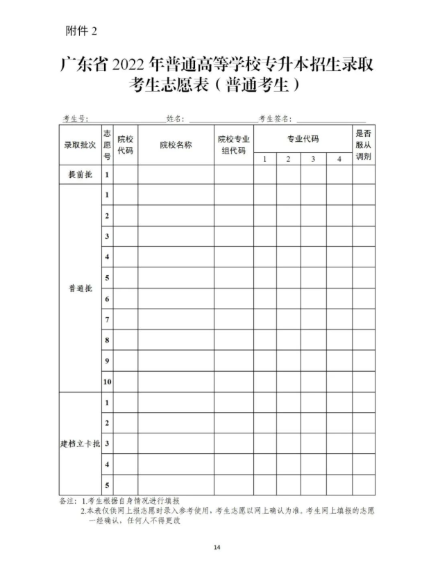 考生上网填报志愿前,可预先填好《广东省2022年普通高等学校专升本招生录取考生志愿表》(见附件,下称“志愿表”)。考生填报志愿时,可参考院校往年录取情况,“冷”“热”搭配,形成合理志愿“梯度”。