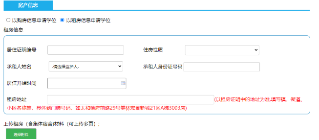 用户要按照系统弹出的【租房信息】所需证明材料提示完成附件上传。