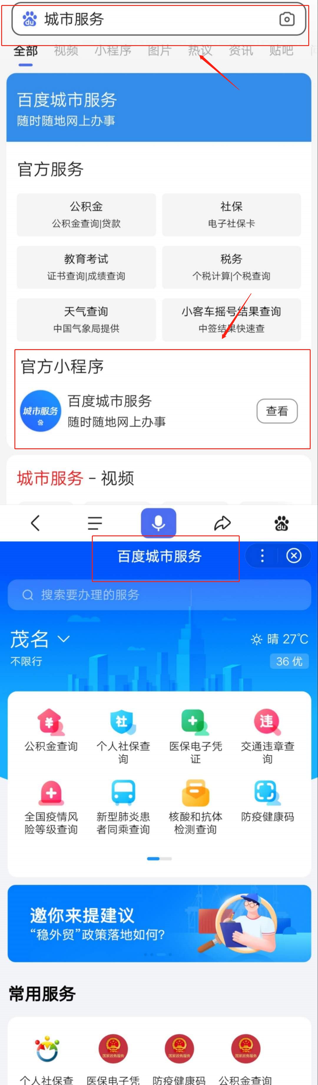 第一步:打开百度APP,并搜索【城市服务】小程序,打开并找到【教育就业】,并选择『中小学教师资格证明查询』。