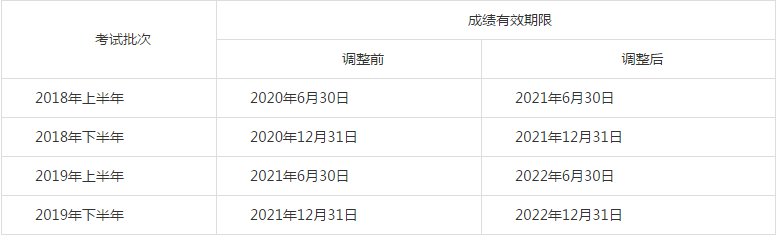 参加“2018年上半年至2019年下半年”各批次笔试,已通过的单科笔试科目成绩有效期延长1年,即成绩有效期由2年延长至3年,成绩查询网站页面会及时更新有效期限。参加“2017年下半年批次(含)之前”单科笔试科目成绩有效期已于2019年12月31日前终止,因此不再延长。(延长批次详见下表)