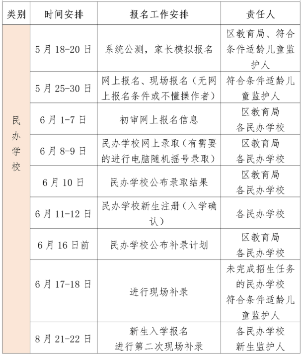 6月17-18日,8月21-22日,未完成招生任务的民办学校组织补录,区教育局根据各民办学校注册录取的情况,在系统公布未完成招生任务的民办学校名单和剩余学位数。有意向选择民办学校就读的适龄儿童,可到未完成招生任务的民办学校现场报名。