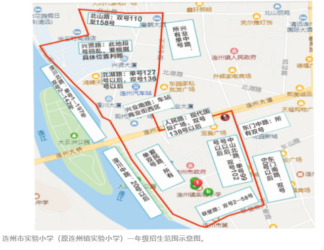 (二)连州市实验小学(原连州镇实验小学):东门南路与联碧路交汇点经联碧路向西到河边沿河边向北至连州大道路口(大润发门口路口)向东经连州大道到万里鞋店路口向南经东门中路至东门南路与联碧路交汇点市区区域;连州大道与湟川中路交汇点(大润发门口路口)向北经沿江路到沿江花园二期路口(连州市农业农村局街道河边路口)向东到米兰酒店路口与湟川北路交汇点向北至与北山路交汇点向东经北山路到皇朝大酒店路口向南经兴业中路至兴业南路路口市区区域。
