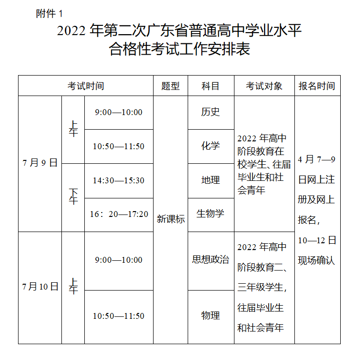 2022年第二次合格性考试考试科目为思想政治、物理、历史、地理、化学和生物学等6门,按照《实施办法》实施,其中思想政治和物理2门科目接受2022年具有广东省户籍的广东省高中阶段学校二、三年级学生,往届毕业生和16周岁以上的社会青年报考;历史、地理、化学和生物学等4门科目接受2022年具有广东省户籍的广东省高中阶段学校在校学生,往届毕业生和16周岁以上的社会青年报考。考生根据自己所学课程的课程标准、学习进度情况和普通高校招生专业对合格性考试科目的要求,报名参加其中1—6门科目合格性考试。