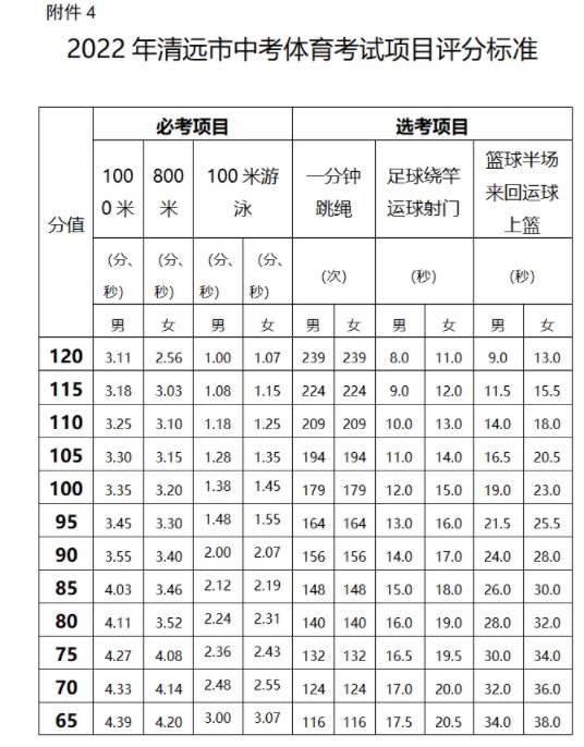 2022清远市中考体育考试项目评分标准 清远市中考体育评分标准2020