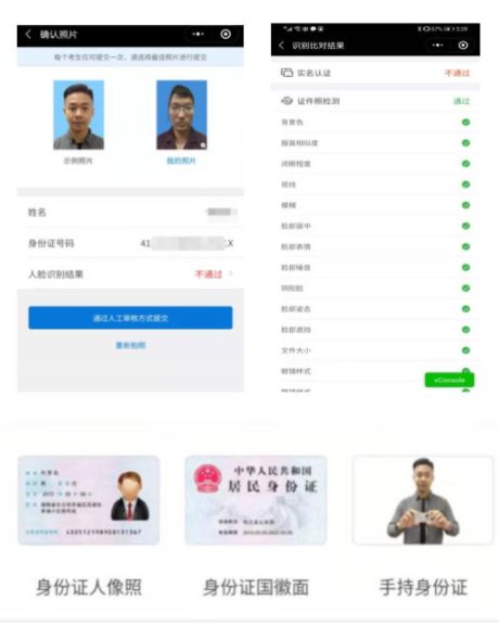识别不通过时可以点击人脸识别结果查看不通过原因并重新尝试,当多次尝试不过后可以选择通过人工审核方式提交(需补充身份证正反面、手持身份证相片),等待人工审核(审核仍不通过的,及时与当地自学考试办公室联系咨询)。