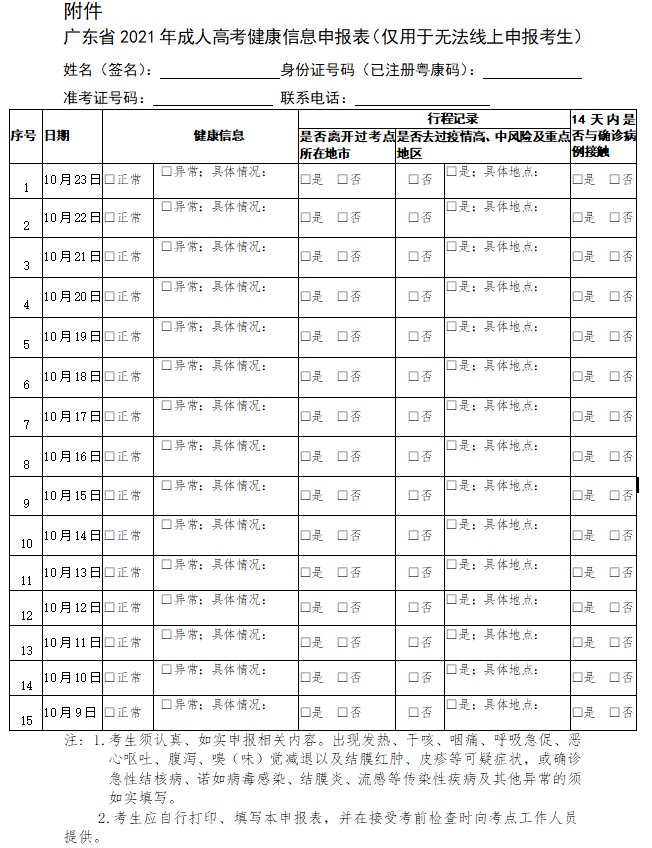 点击下载:广东省2021年成人高考健康信息申报表(仅用于无法线上申报考生)