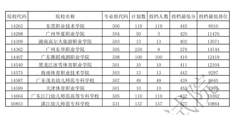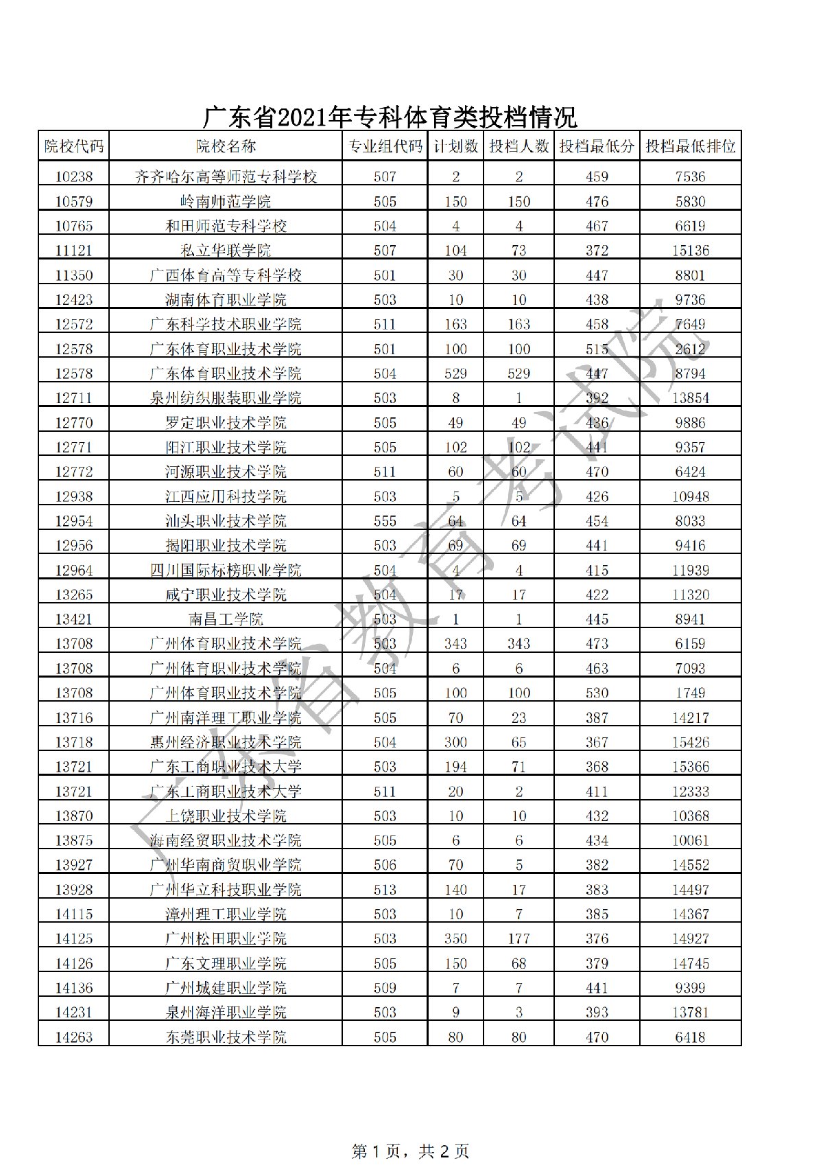 2021年广东专科体育类统考投档情况 广东省2021年本科体育类投档情况