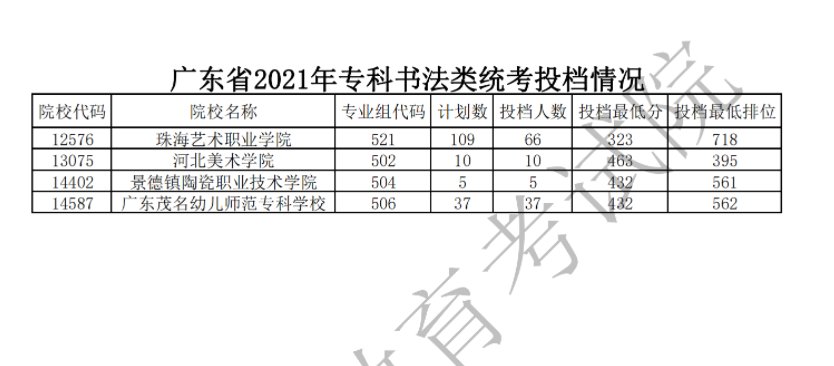广东2021年专科书法类统考投档情况 2021年广东书法生多少分上本科