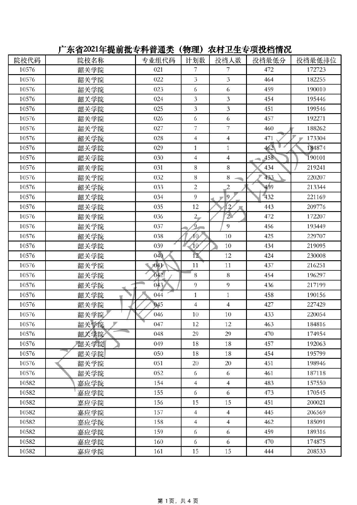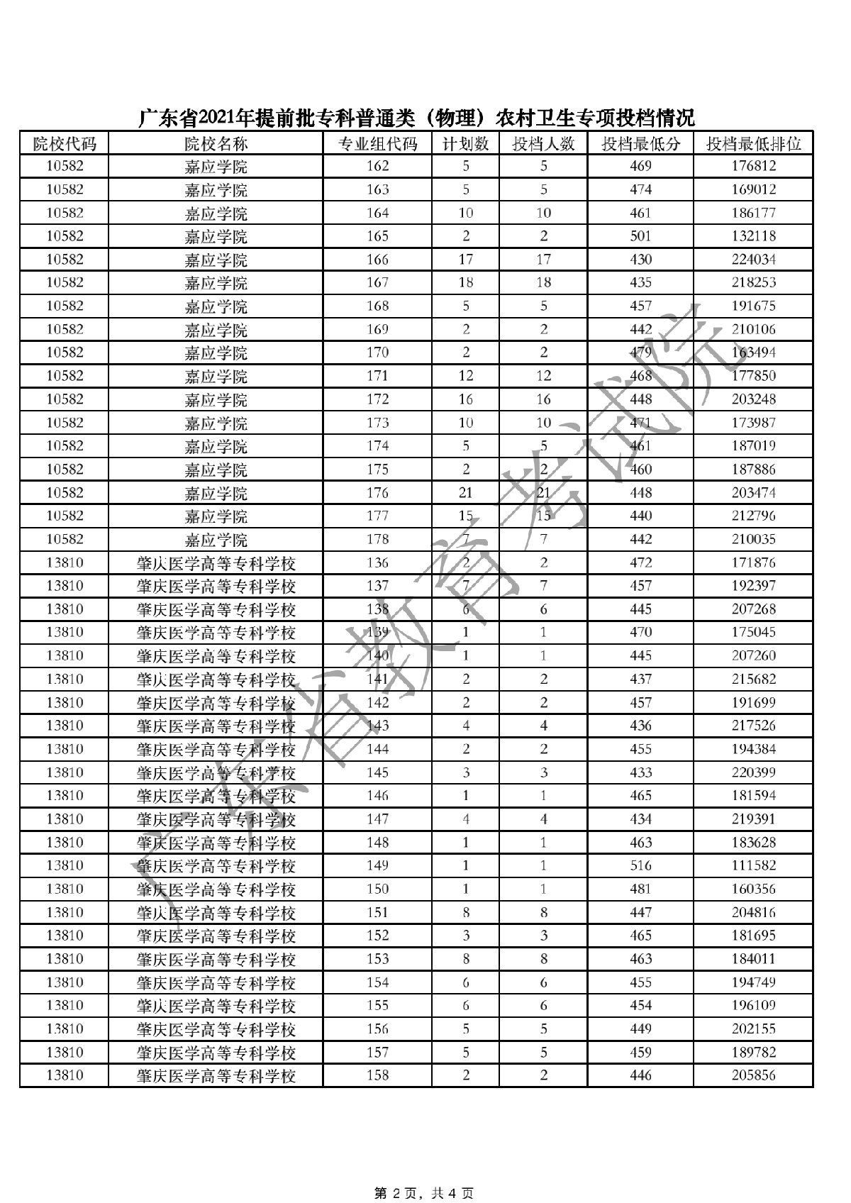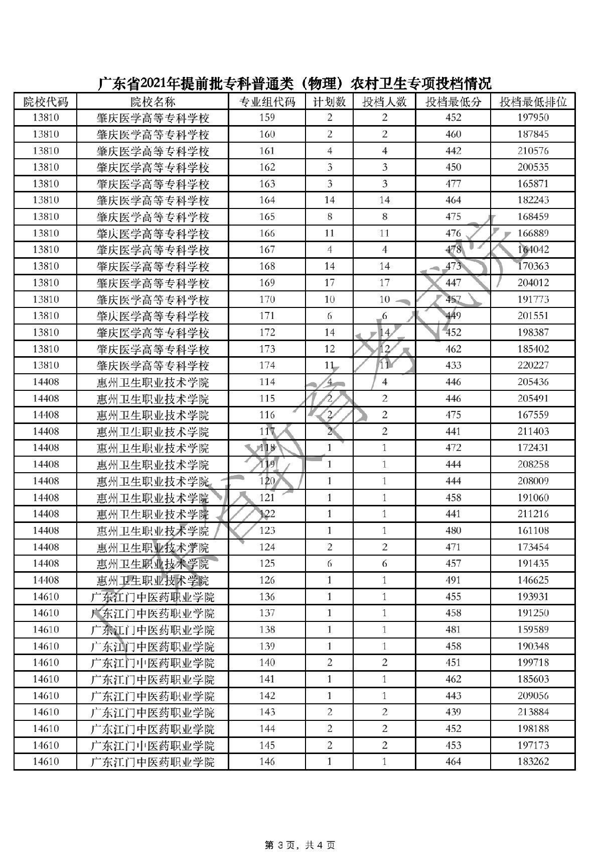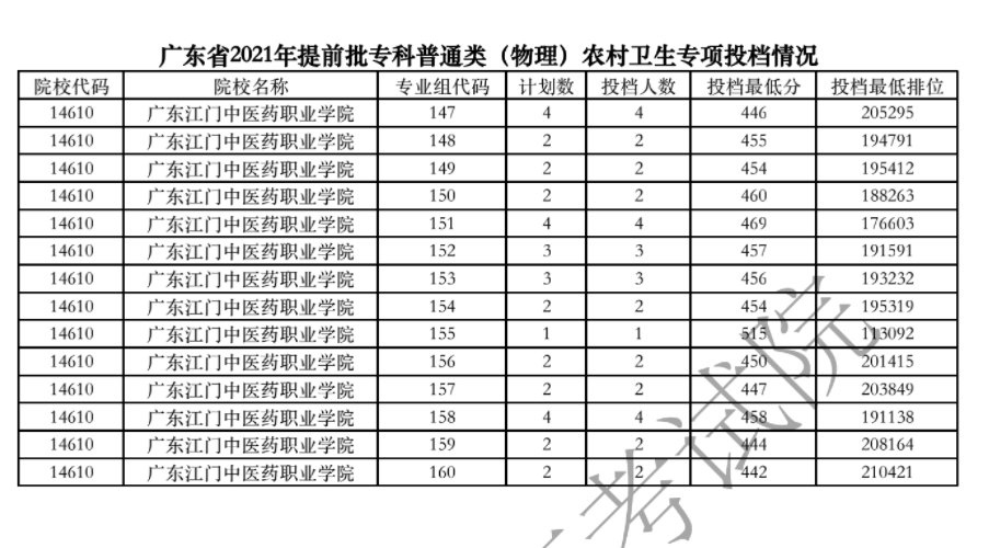 所有院校专业组均一次性满档。从投档分数来看,提前批专科卫生专项计划院校专业组投档线普遍较高,其中普通类(历史)的肇庆医学高等专科学校112组、惠州卫生职业技术学院110组,普通类(物理)的肇庆医学高等专科学校149组、广东江门中医药职业学院155组、嘉应学院165组投档线均超过500分。