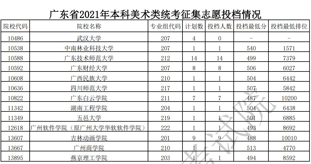 注:点击图片可查看大图,也可点击pdf文件进行查看(广东省2021年本科美术类统考征集志愿投档情况.pdf)