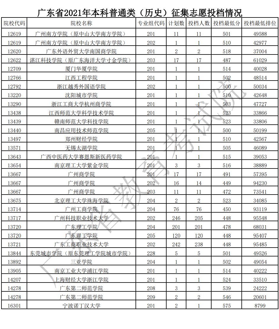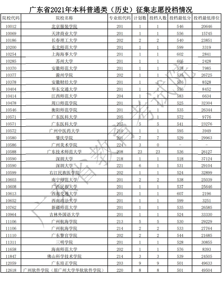注:点击图片可查看大图,也可点击pdf文件进行查看(广东省2021年本科普通类(历史)征集志愿投档情况.pdf)
