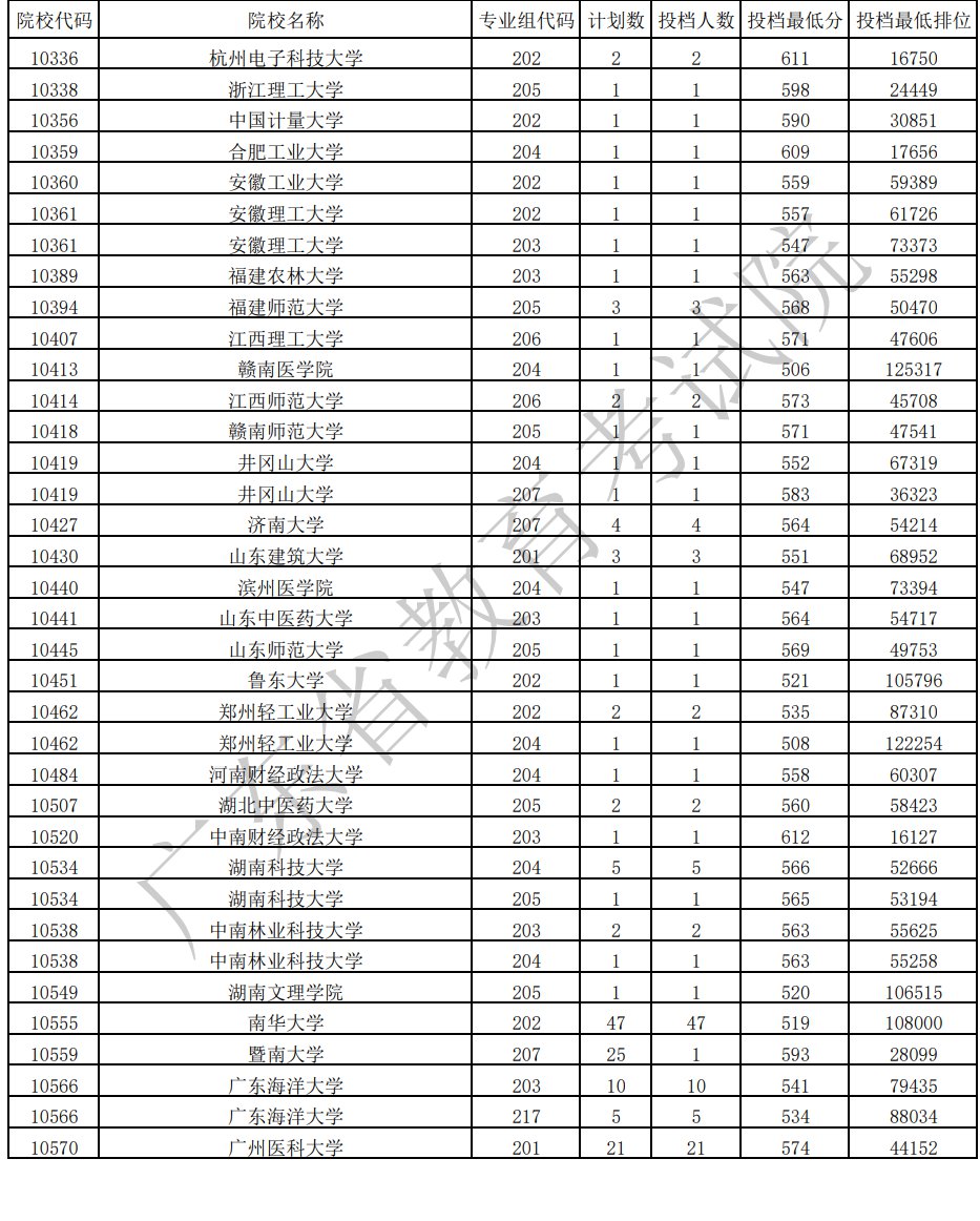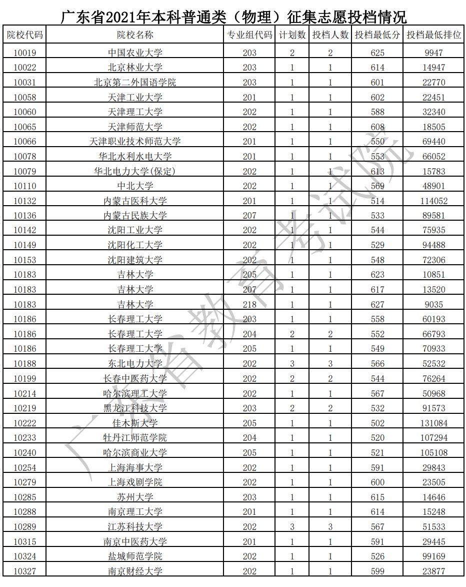 广东省2021年本科普通类(物理)征集志愿投档情况