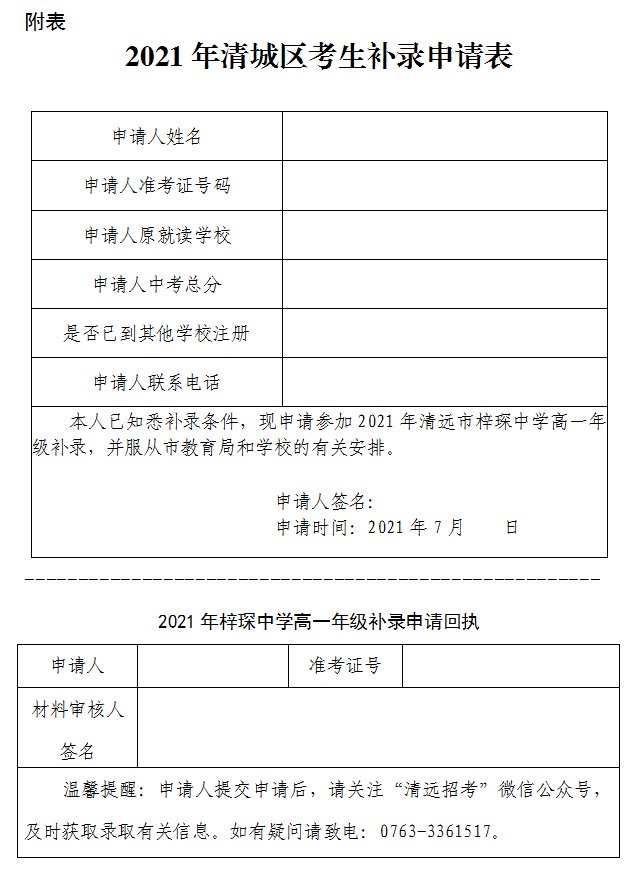 3.《2021年清城区考生补录申请表》。为避免现场混乱,并尽量缩短考生及家长排队等候的时间,请提前下载此表格,并认真阅读填报说明后准确填写。