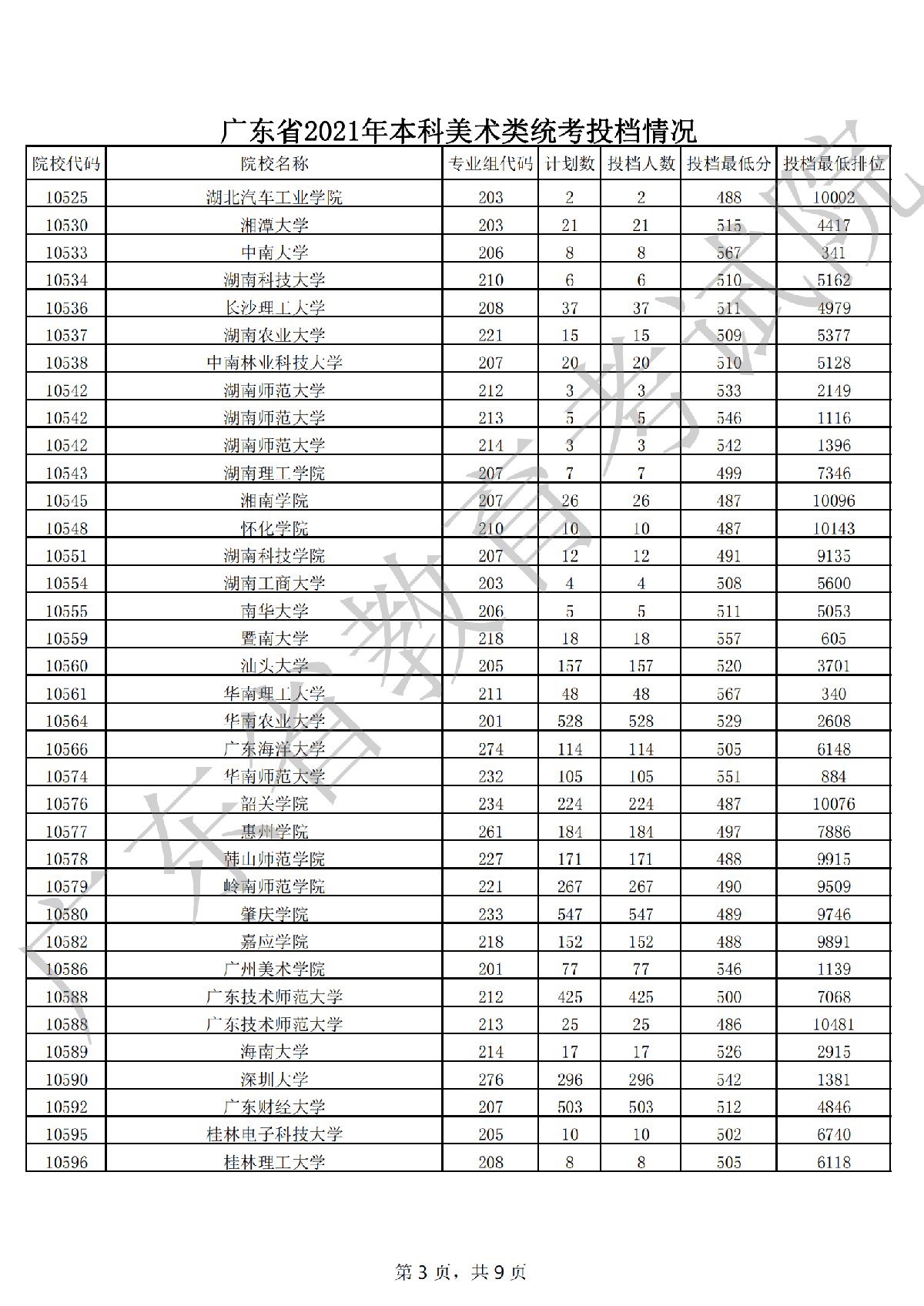 2021年广东本科美术类统考投档情况(2021广东美术本科投档线)