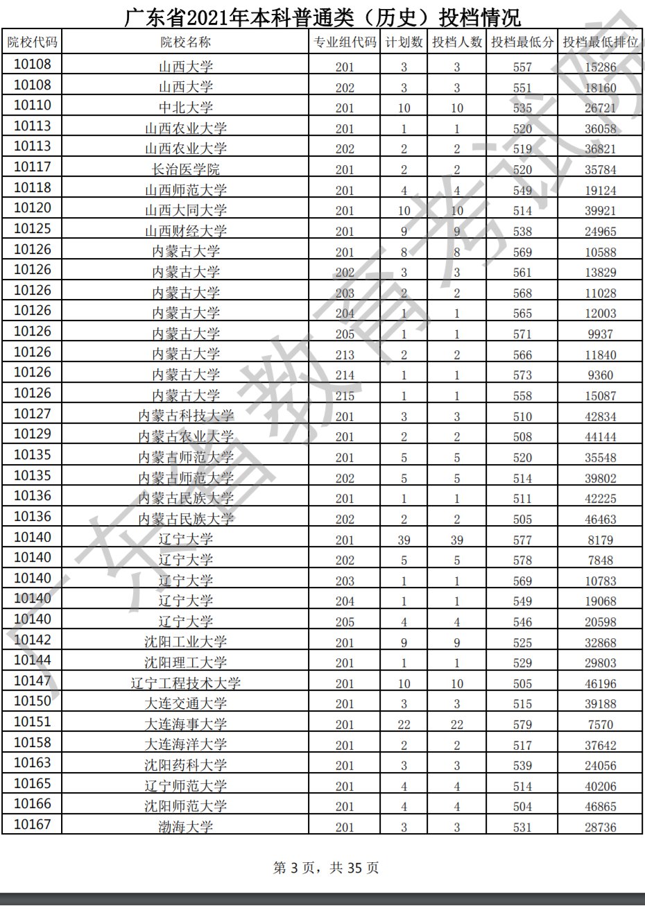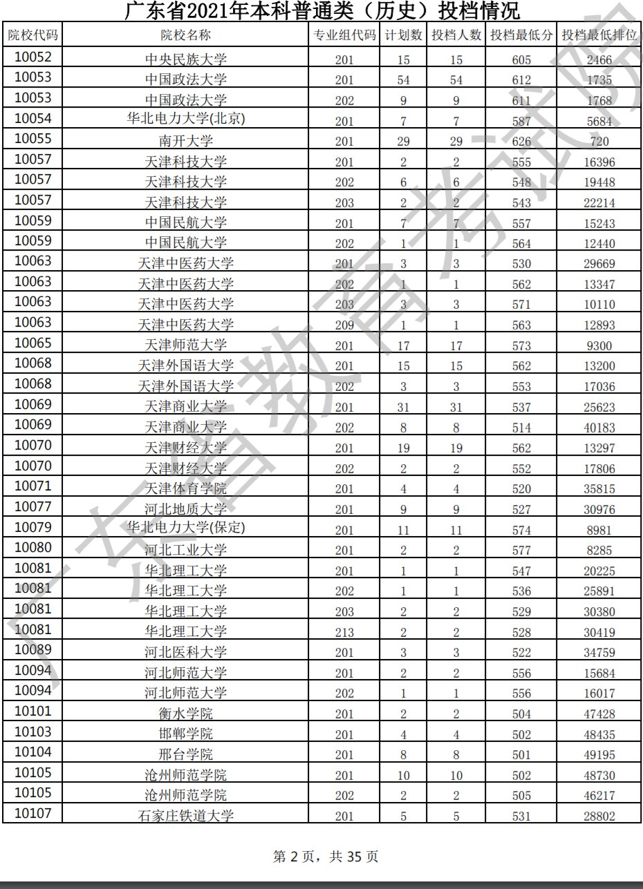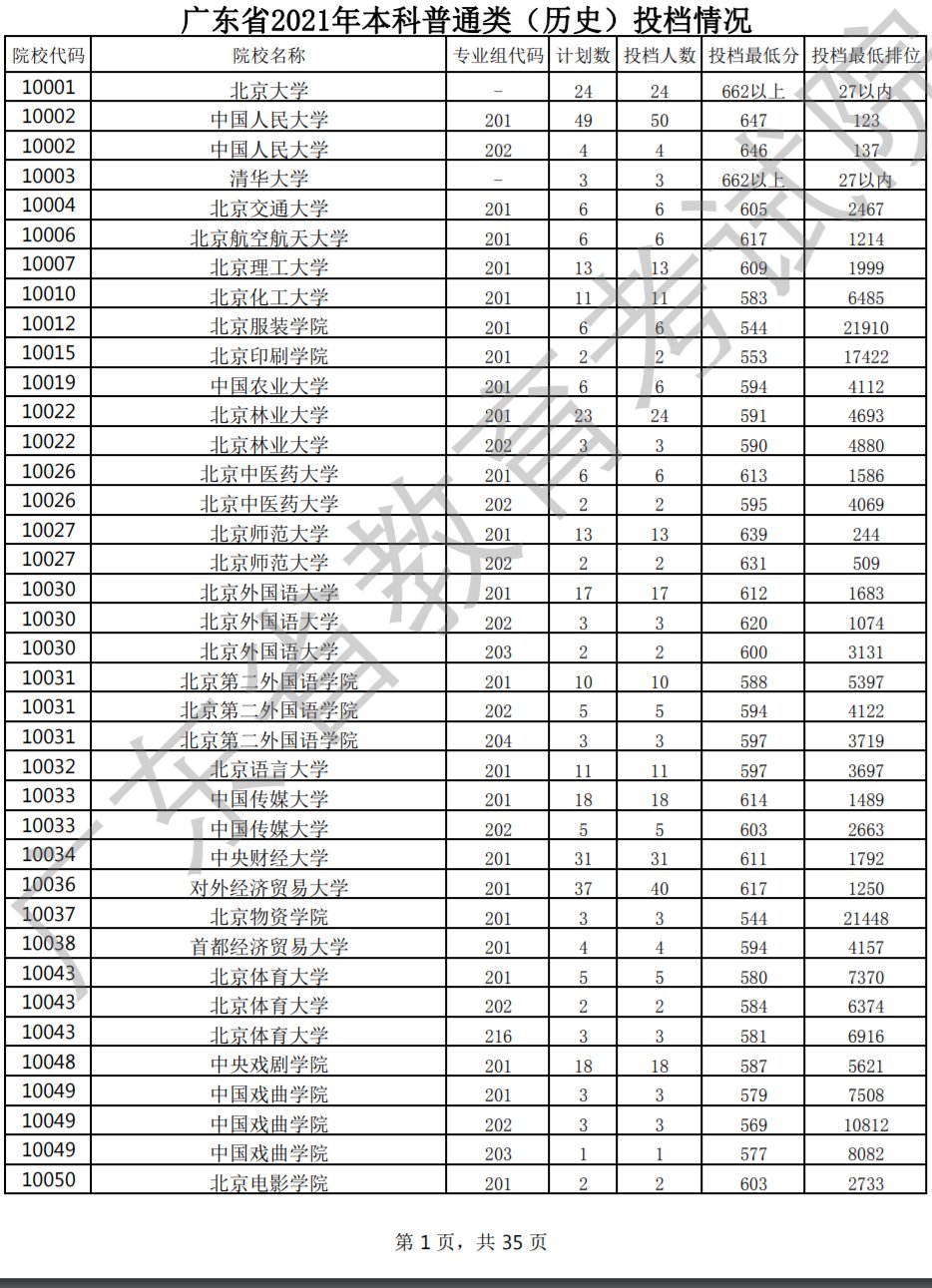 7月20日,广东省2021年普通高考本科批次正式投档录取,共投出考生290956人,其中,普通类(历史)投出77307人。广东省2021年本科普通类(历史)具体投档情况详见下表。