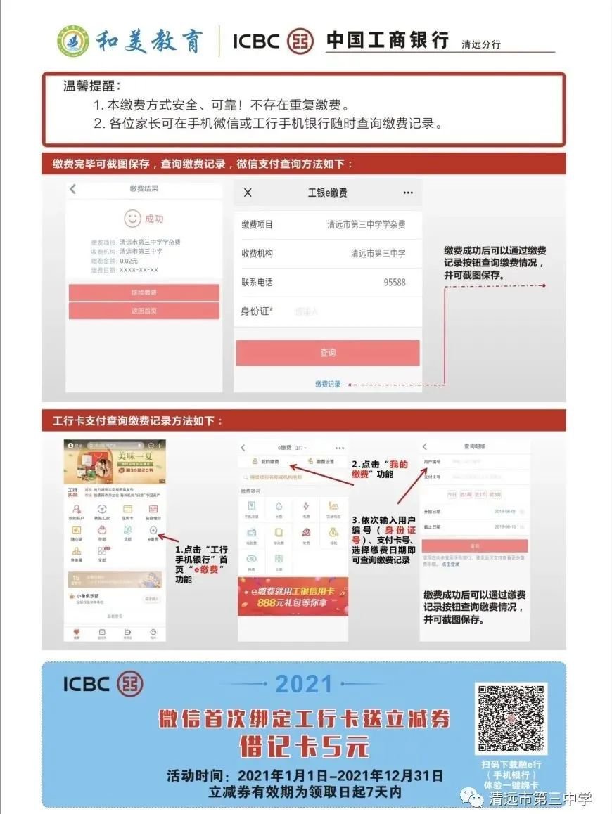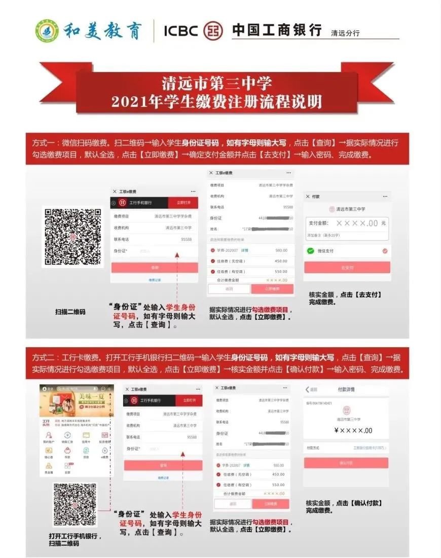 缴费注册须知一、请被我校录取的新生于7月17、18日内,关注“清远市第三中学微官网(公众号)”,按下图《清远市第三中学2021年学生缴费注册流程说明》进行缴费注册。
