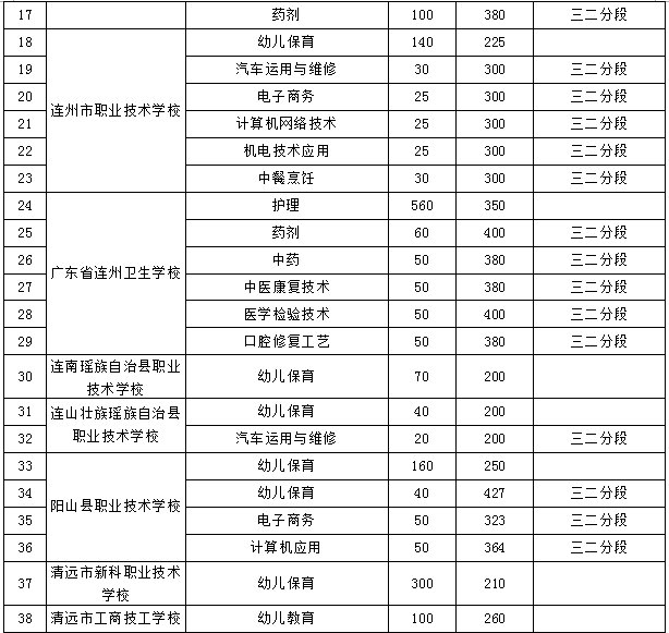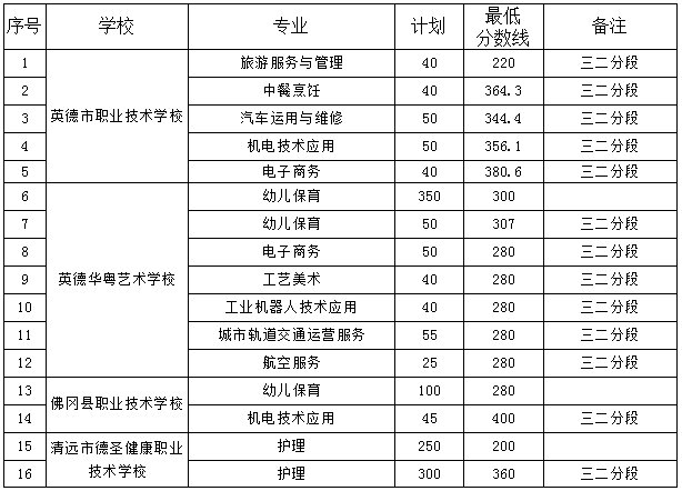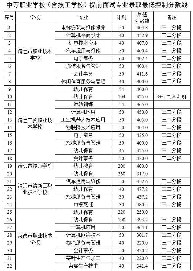 清远市第二批中等职业学校(含技工学校)部分专业招生录取最低控制分数线,具体如下: