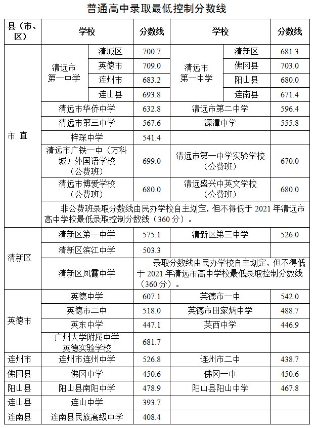 2021年清远市普通高中学校高一新生录取最低控制分数线为360分。