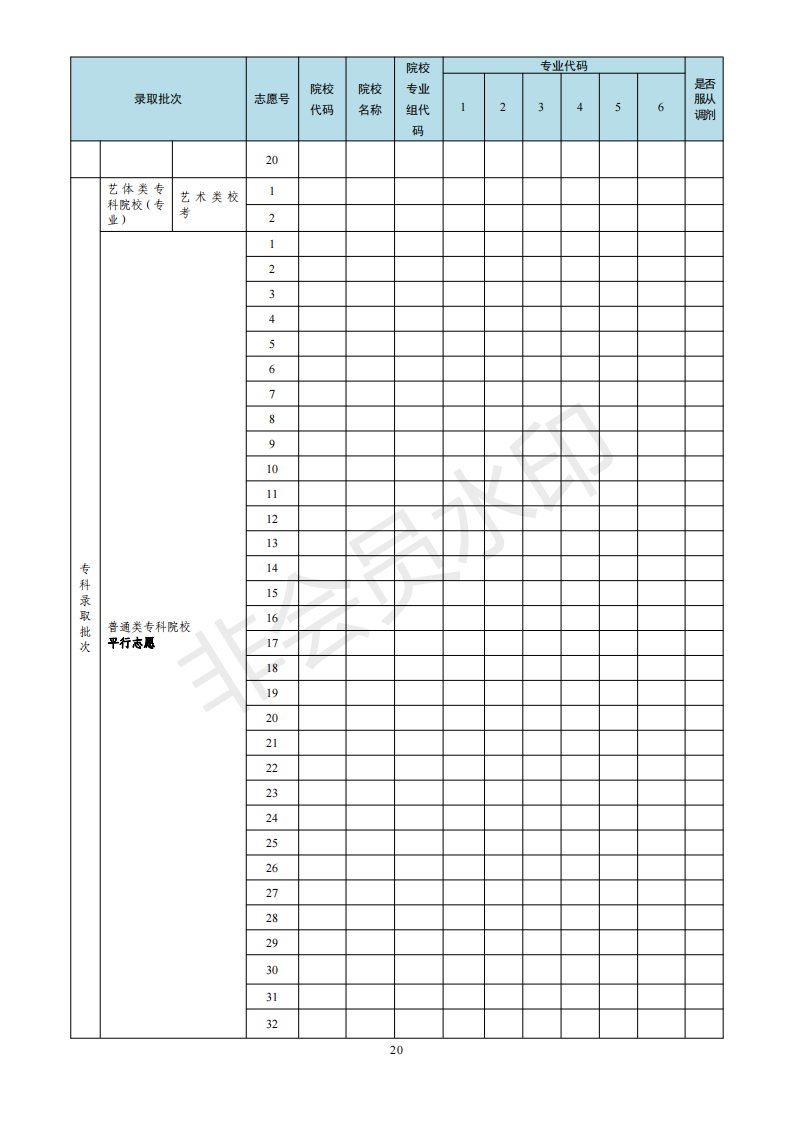 本科和专科录取批次普通类(物理、历史)均设1个平行志愿组,分别设置45个院校专业组志愿数,每个院校专业组设6个专业志愿和1个是否服从专业调剂选项。艺体类统考设1个平行志愿组,设20个院校专业组志愿,每个院校专业组设6个专业志愿和1个是否服从专业调剂选项。