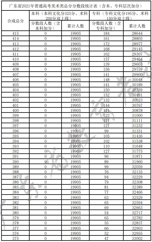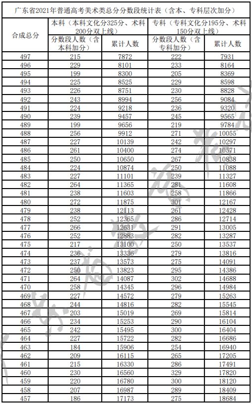 广东省2021年普通高考美术类总分分数段统计表(含本、专科层次加分)