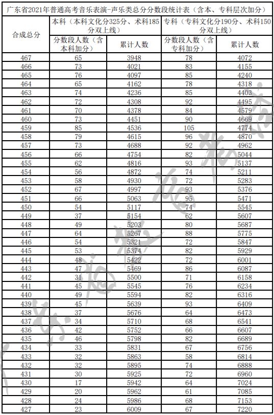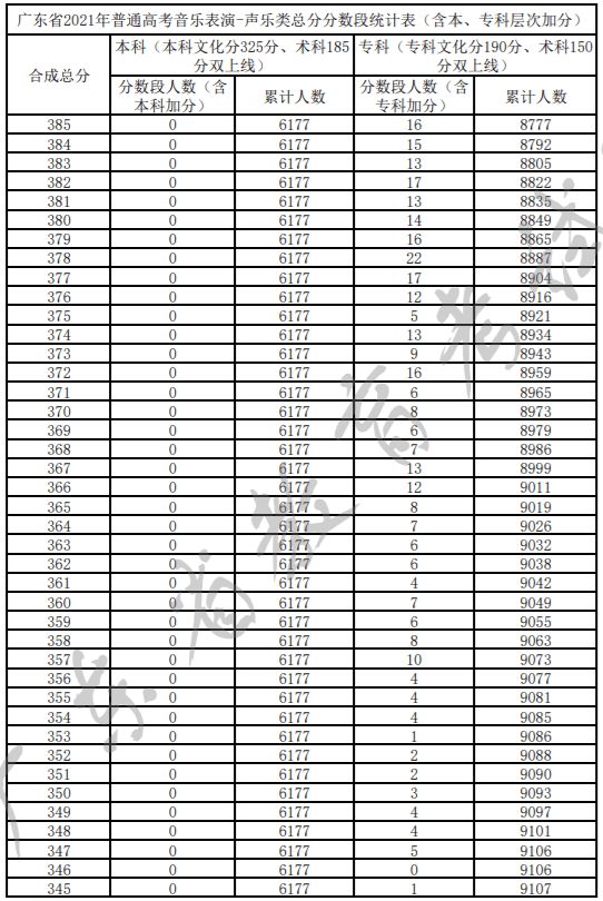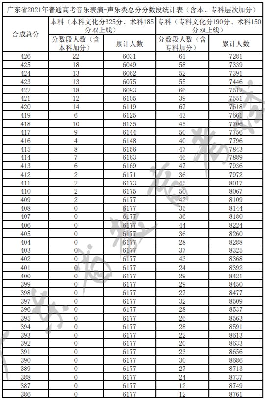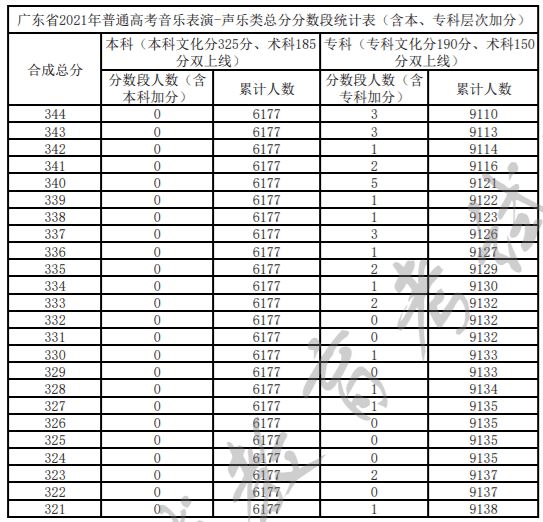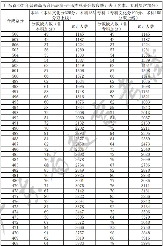 广东省2021年普通高考音乐表演-声乐类总分分数段统计表(含本、专科层次加分)