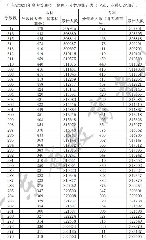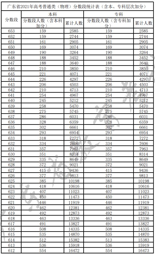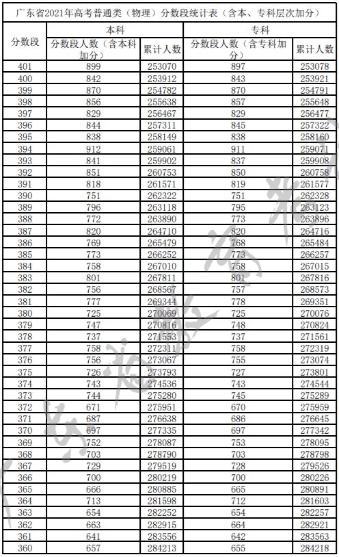 广东省2021年高考普通类(物理)分数段统计表(含本、专科层次加分)