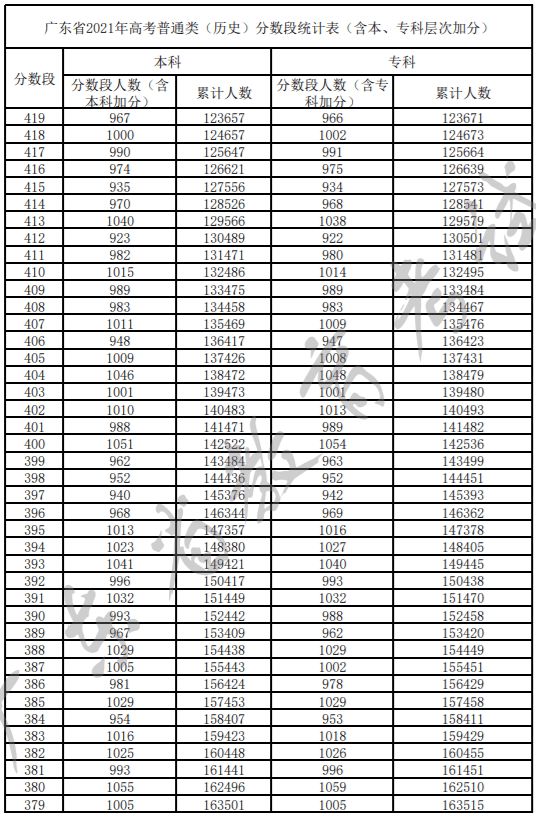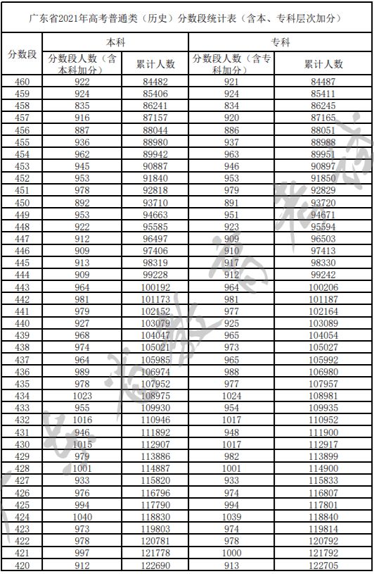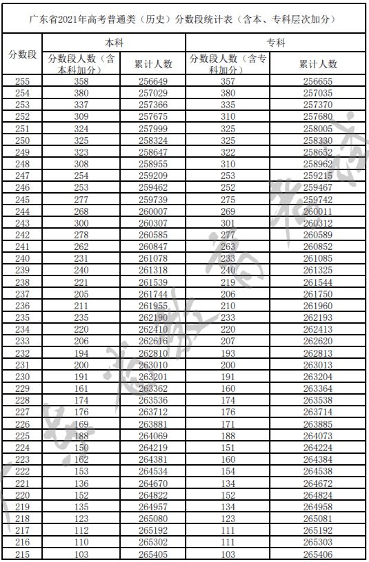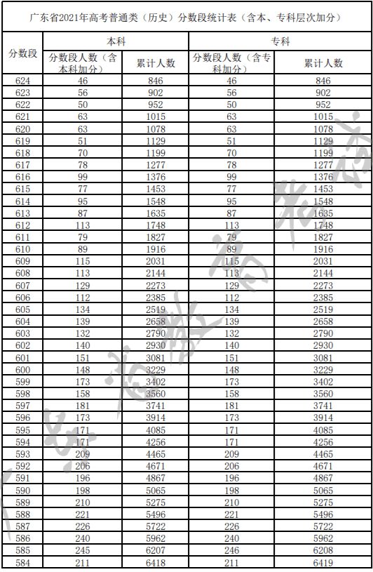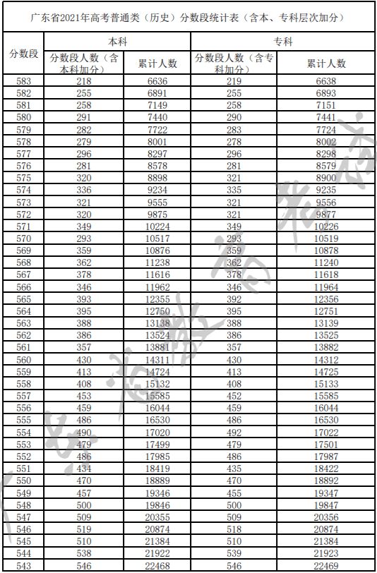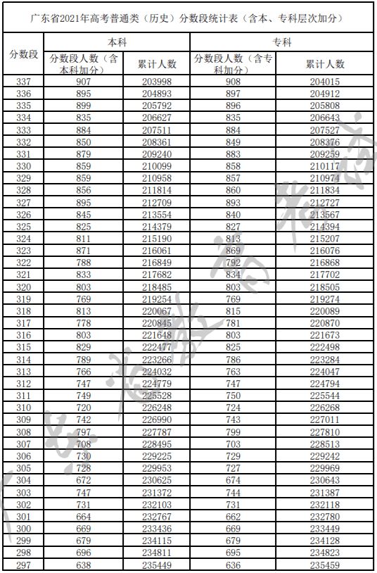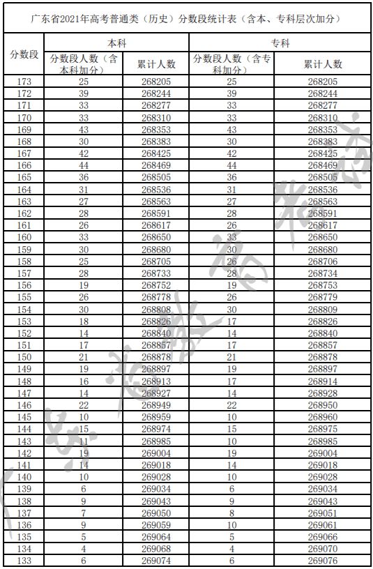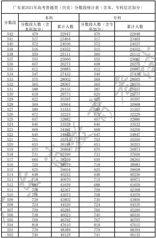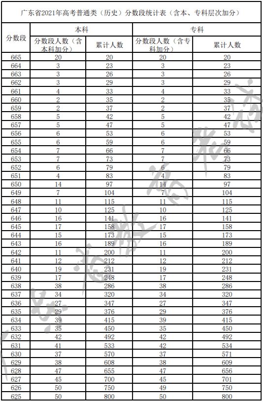 广东省2021年高考普通类(历史)分数段统计表(含本、专科层次加分)