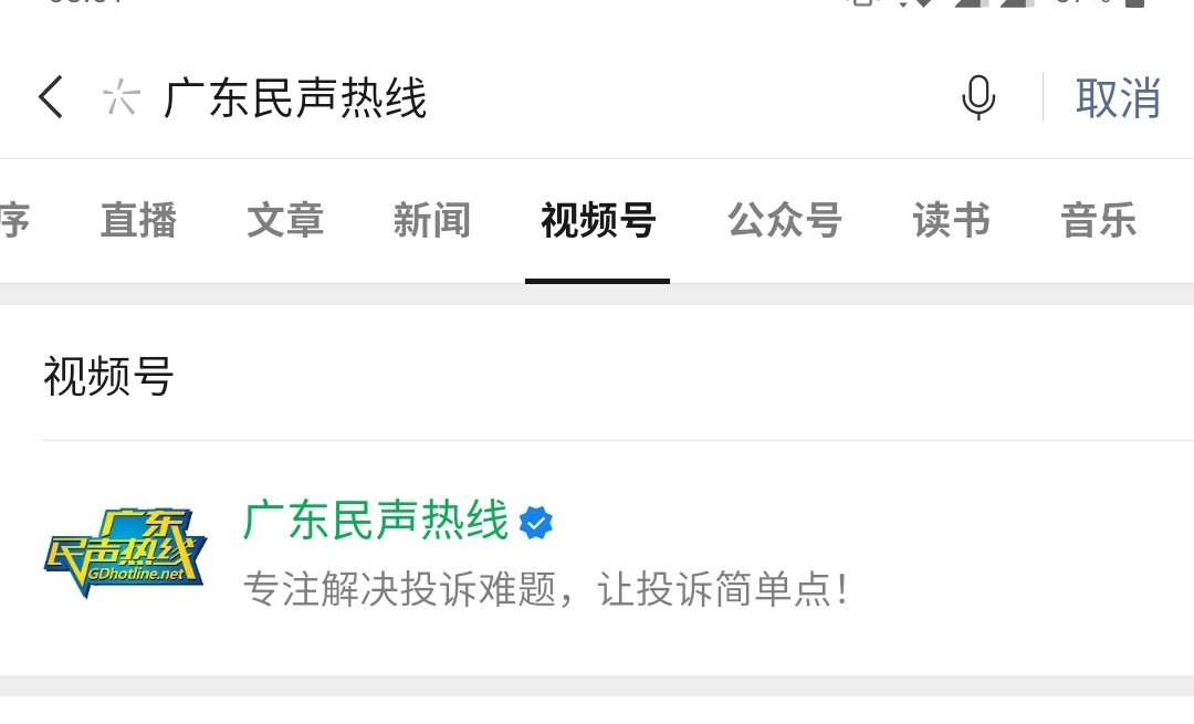 第一步:在微信搜索视频号框中输入“广东民声热线”,如下图所示: