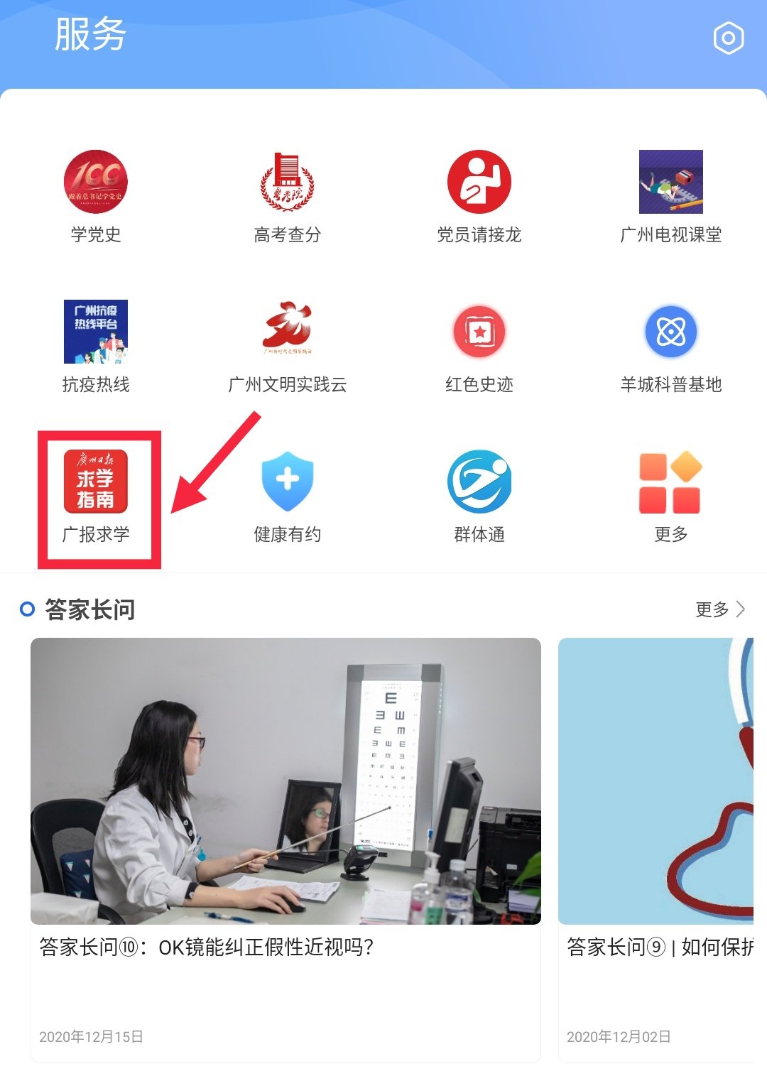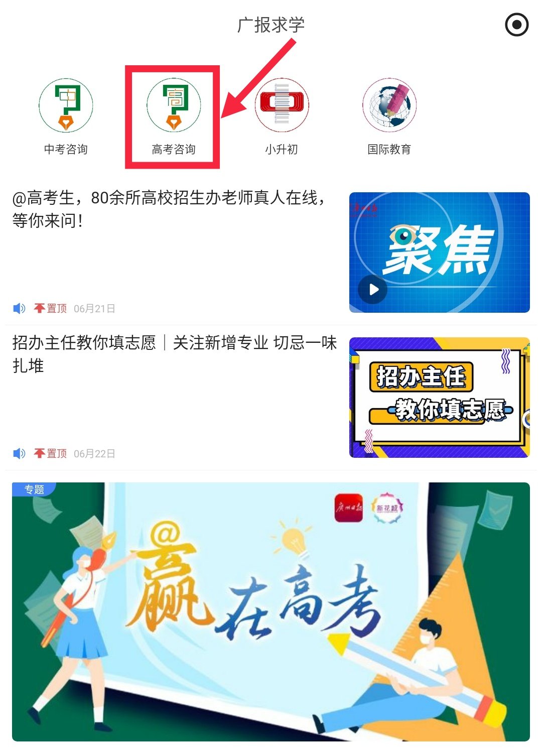 第二步:进入APP首页,点击首页下方“服务”板块,再点击“广报求学”,随后点击“高考咨询”,就可进入咨询页面。