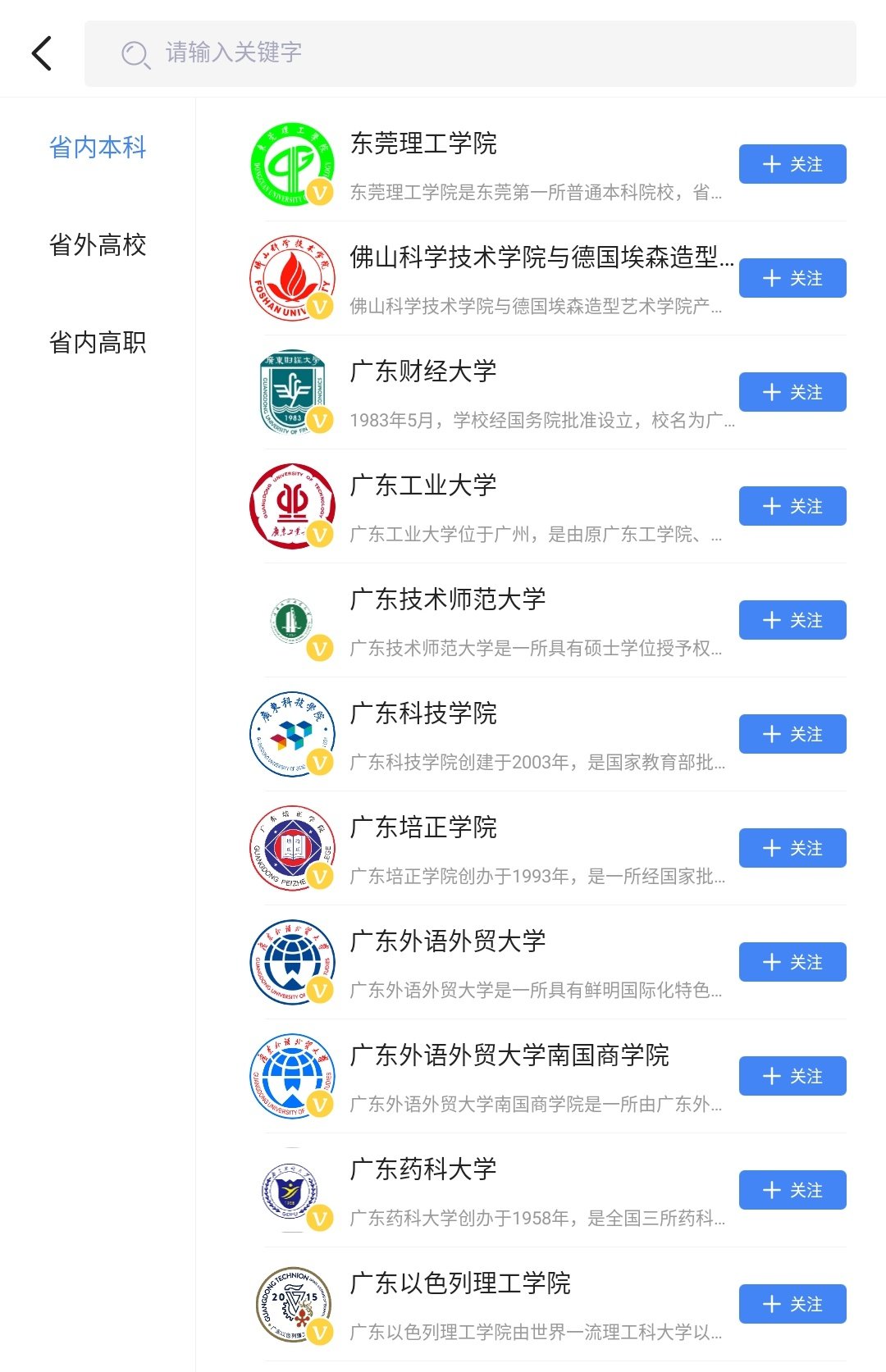 考生可以按照学校所属类别(省内本科、省内高职、省外高校)查找,或者在搜索框搜索,点击对应学校一栏右方的“+关注”,即可查询该校展示的图文和音视频等信息,也可进行在线咨询。