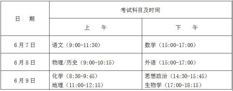 语文、数学、外语的考试时长与改革前一样,语文科目为150分钟,数学、外语科目均为120分钟;物理、历史、化学、地理、思想政治、生物学每科考试时长75分钟;6月9日上午化学与地理两门科目之间、下午思想政治与生物学两门科目之间间隔75分钟。