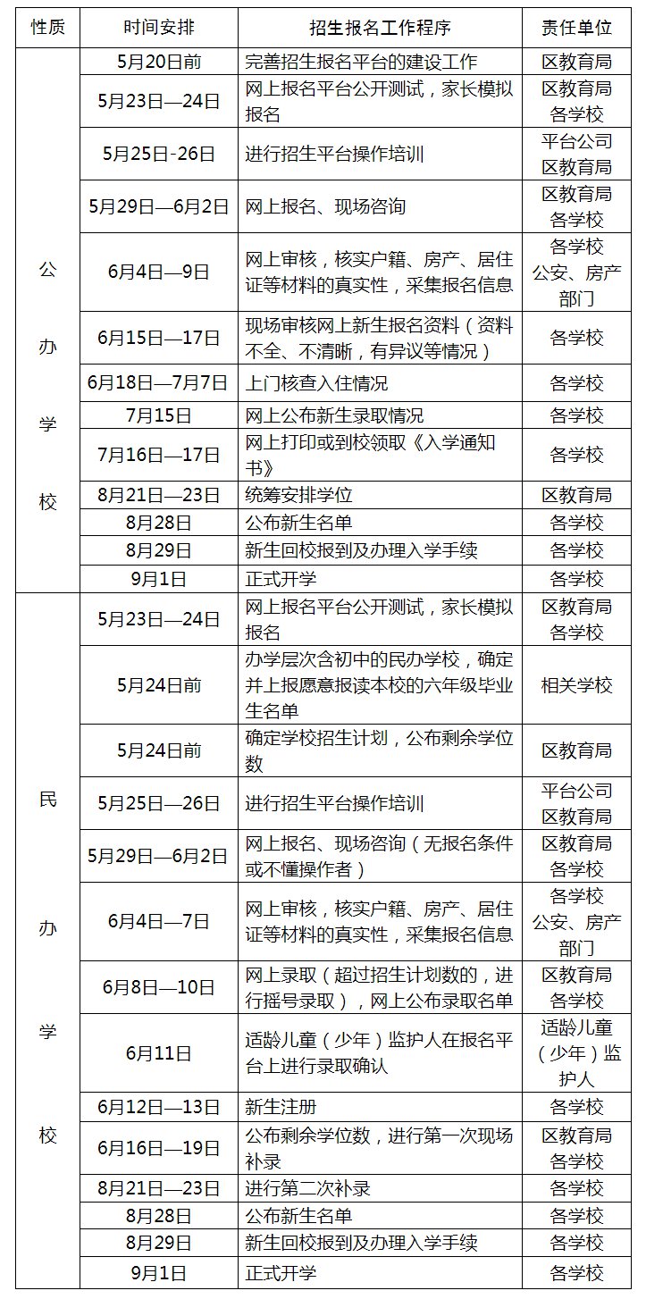 公办6月4日—9日,民办6月4日-7日,各招生学校对网上报名的适龄儿童(少年)报名材料进行审核。学校对已报名的适龄儿童(少年)户籍、房产等信息收集、整理,报送公安、房产相关部门核验。民办学校初步确定符合入读条件的新生名单。