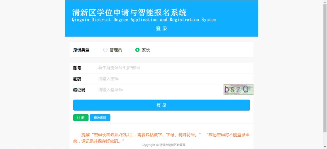 电脑端访问清远市清新区人民政府官网,通过政府网上的入口进入“清新区学位申请与智能报名系统”。微信端则通过“易清新”小程序上的入口,对系统进行访问。