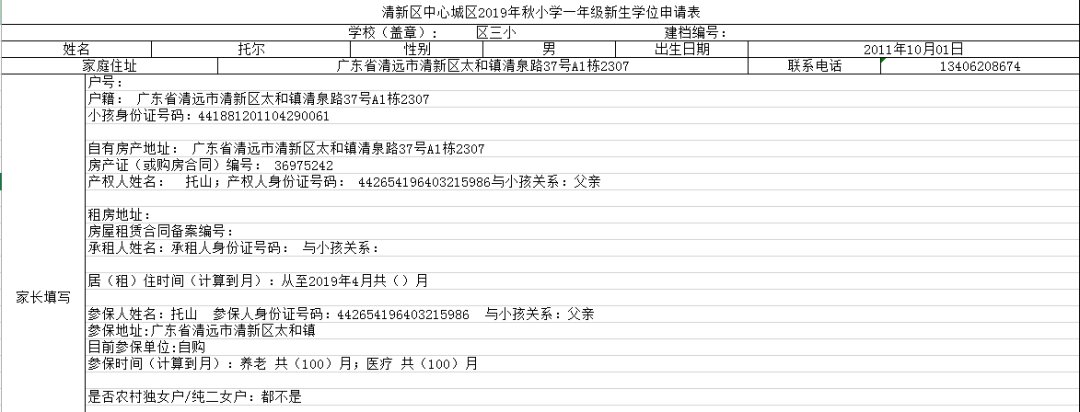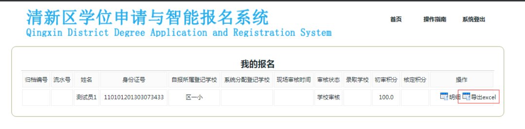 用户登录后点击“我的报名”按钮后可以进入“我的报名”页面,查看当前报名进度、初评积分等。在确定了现场审核时间后,申请公办学校的用户,可以在清新区人民政府门户网站登录系统,在本页导出《新生学位申请表》,导出时系统会生成一个excel文件供用户下载。用户可以下载到电脑上,用打印机进行打印。