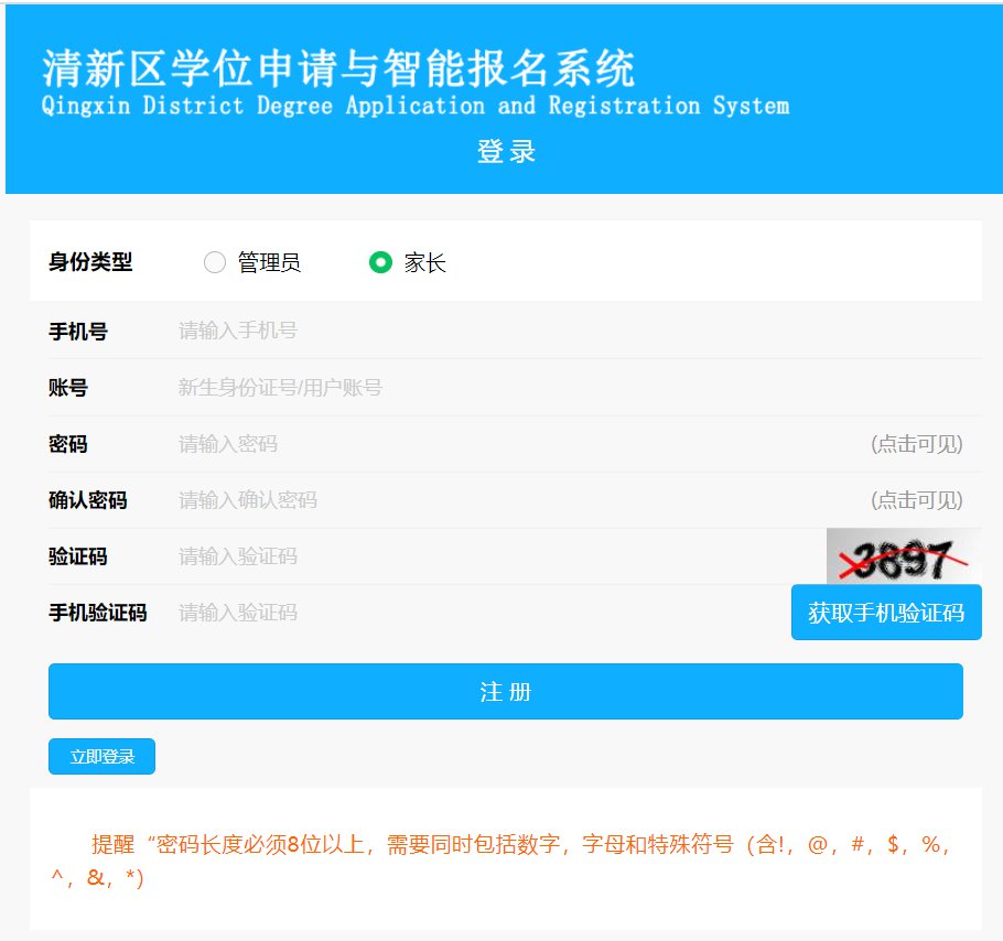 注册:手机号输入操作系统报名的监护人的手机号码,在账号输入框中填写新生的身份证号码,再填写密码,填写图片验证码(纯数字),点击“获取手机验证码”按钮,在收到6位数的短信验证码后填入手机验证码,信息核对无误后点击“注册”按钮进行注册。