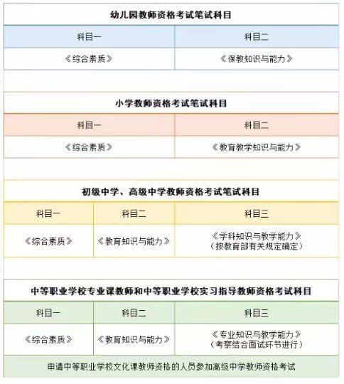面试科目如下:申请面试学科(学段)应与笔试学科(学段)一致。·幼儿园面试不分科。·小学面试科目按教育部有关规定确定。·初级中学、高级中学、中等职业学校文化课教师资格面试科目与笔试的《学科知识与教学能力》科目一致。·中等职业学校专业课教师和实习指导教师的教师资格面试按《广东省中等职业学校专业课教师和实习指导教师资格考试面试大纲》(粤教继函(2016]37号)规定进行。