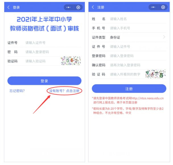 点击登录页的“还没有账号?点击注册”链接,进入注册页面,按页面上的要求填写注册信息。登录时,须输入证件号、密码,以及验证码。