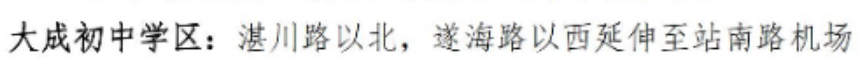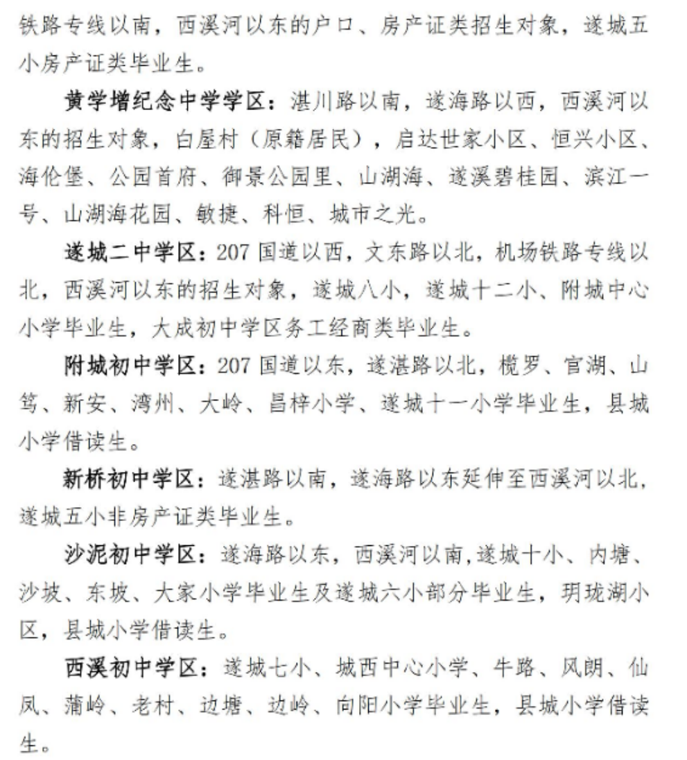 第二批次:大成初中、黄学增纪念中学、遂城二中、附城初中、新桥初中、沙泥初中、西溪初中划片按七类招生对象依次录取,户籍地址与房产证地址不一致的,按房产证地址学区录取。