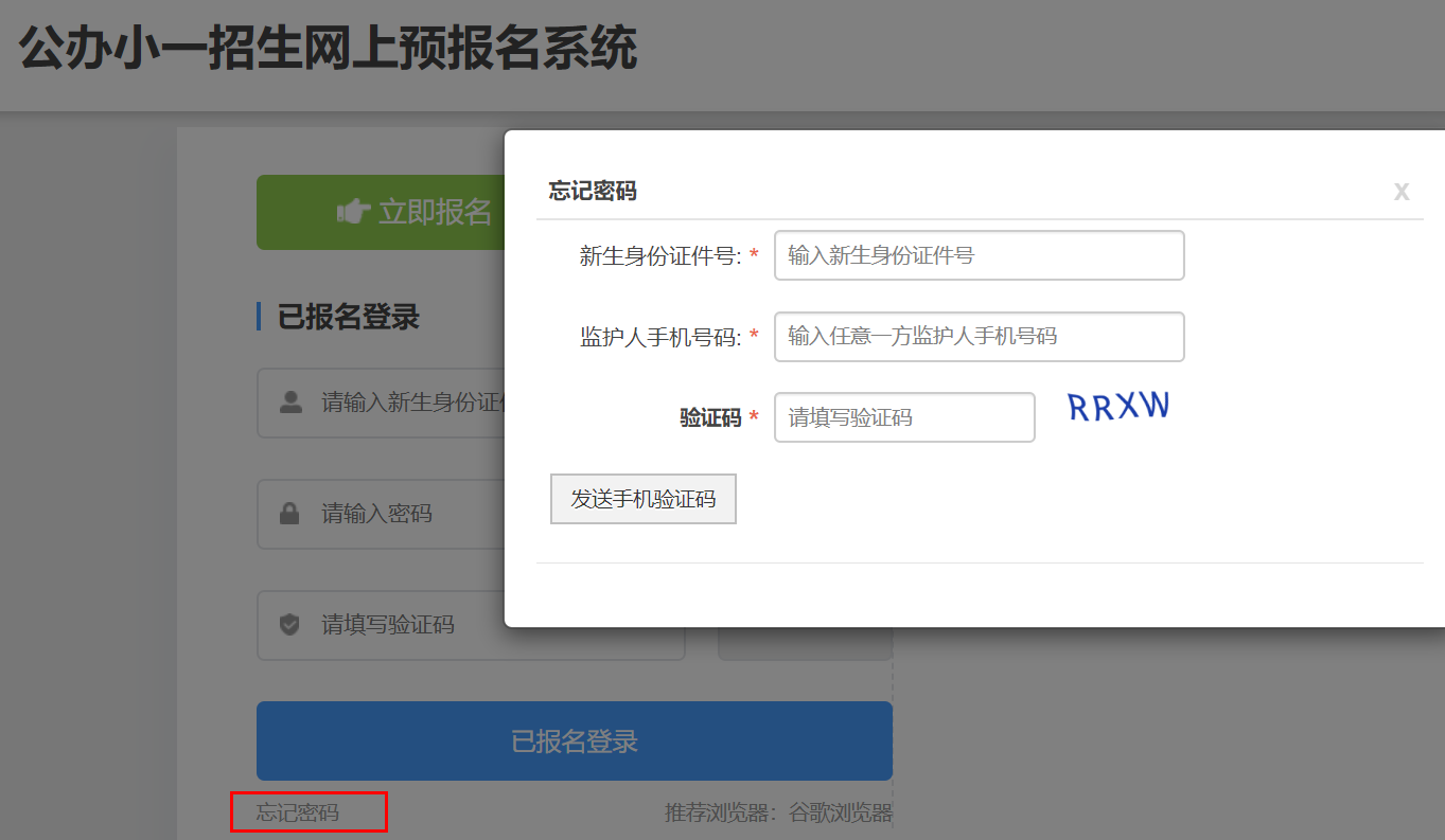 2、家长可通过报名系统报名页面上的【忘记密码】按钮进行密码重置。