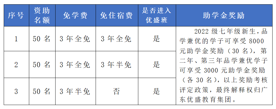 七年级新生(即被我校录取并缴费注册的学生)按照广东优盛教育集团助学金政策,享受综合考核助学金(具体考核时间,另行通知)。