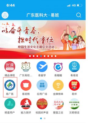 6.进入广东医科大学易班主页,点击:易广医,进入新生工作界面。即可看到)“新生信息采集”、“新生服务中心”、“新生健康申报”等模块。