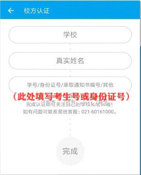 5.进入校方认证界面后输入学校、姓名和身份证号或考生号,点击“完成”即可加入广东医科大学易班大家庭。(全体新生可用身份证识别进行注册;或者用准考证号码注册,其中广东省考生请输入10位数的准考证号码,省外考生请输入14位数的准考证号码,港澳台侨联招考生请输入9位数的准考证号码。)