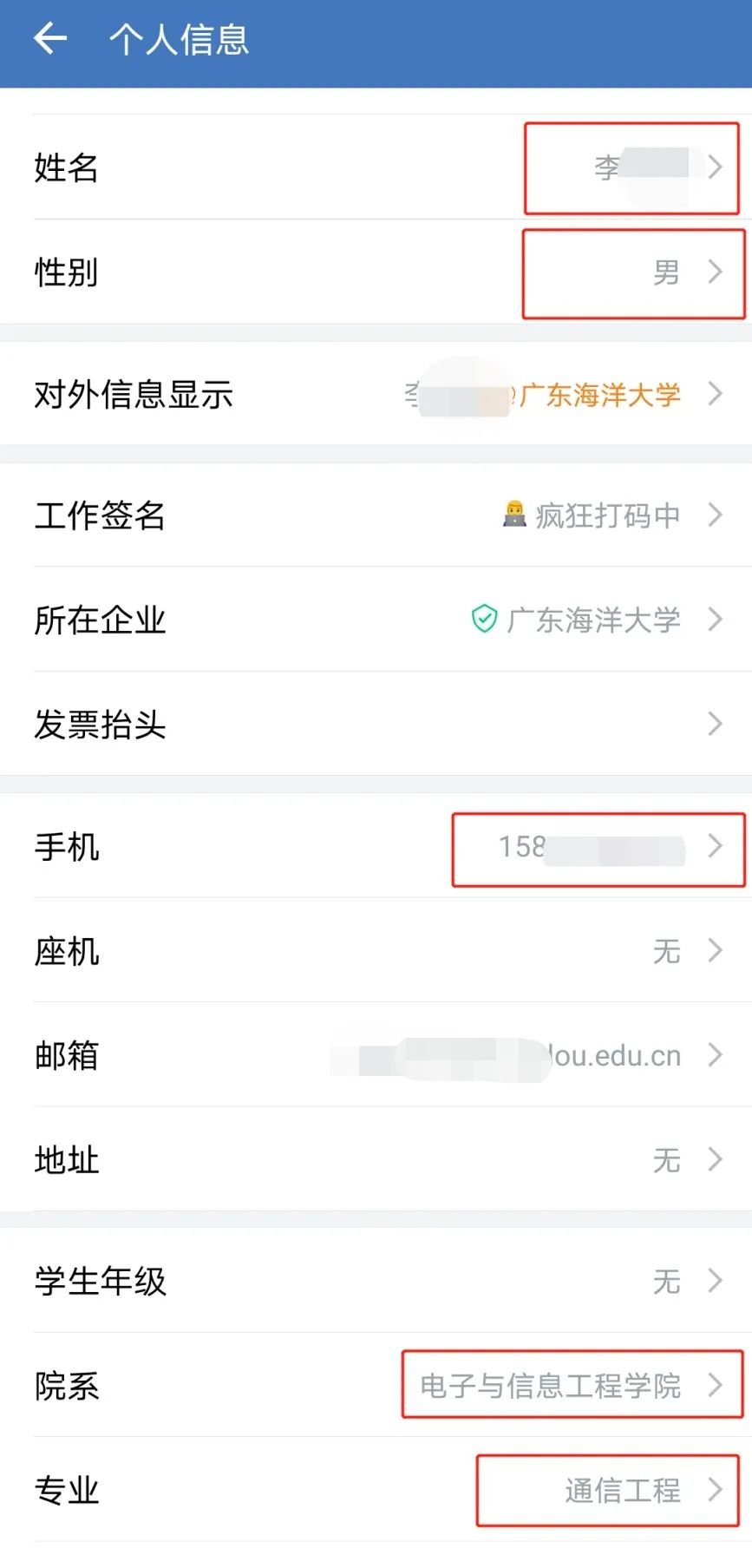 3.修改个人信息:姓名、手机、院系(全称)、专业(全称),其余信息暂时不用填写,等待自动分配。