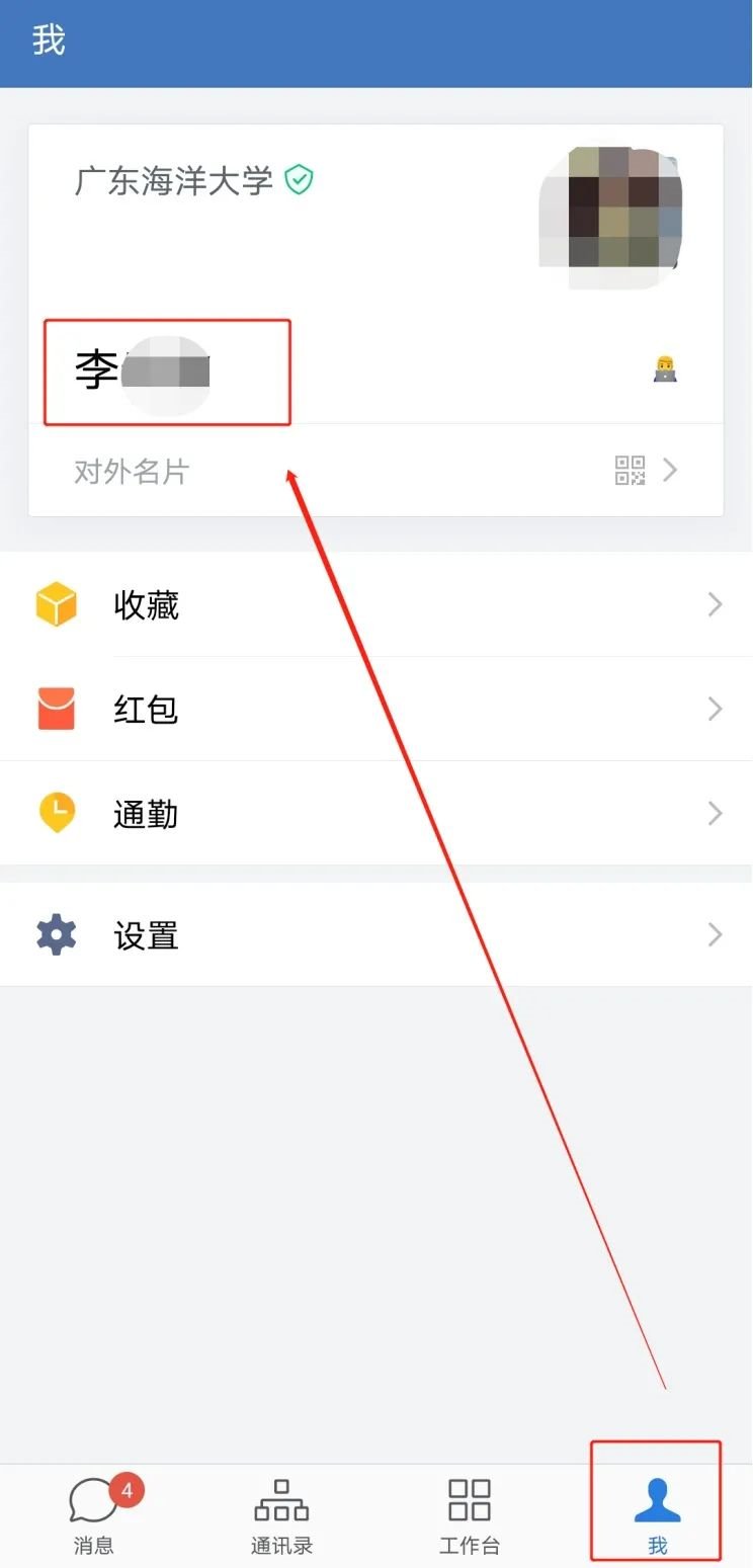 2.登陆学校企业微信后,点击进入企业微信的“我”—“名称”