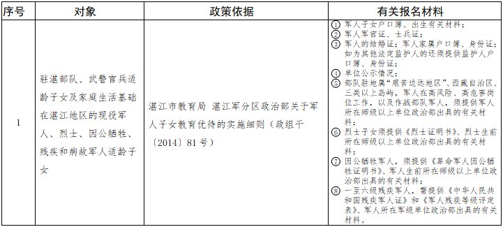 1.驻湛部队、武警官兵适龄子女及家庭生活基础在湛江地区的现役军人、烈士、因公牺牲、残疾和病故军人适龄子女
