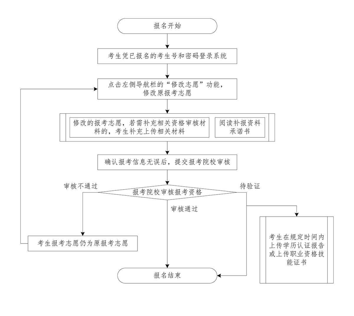 考生须在预报名时完成基本信息填报、在线学历学籍验证、绑定手机、采集相片(微信小程序照相)、上传资料后,在规定时间内提交给招生院校审核报考资格,审核结果通过的考生请尽快完成网上交费手续并牢记考生号和密码。