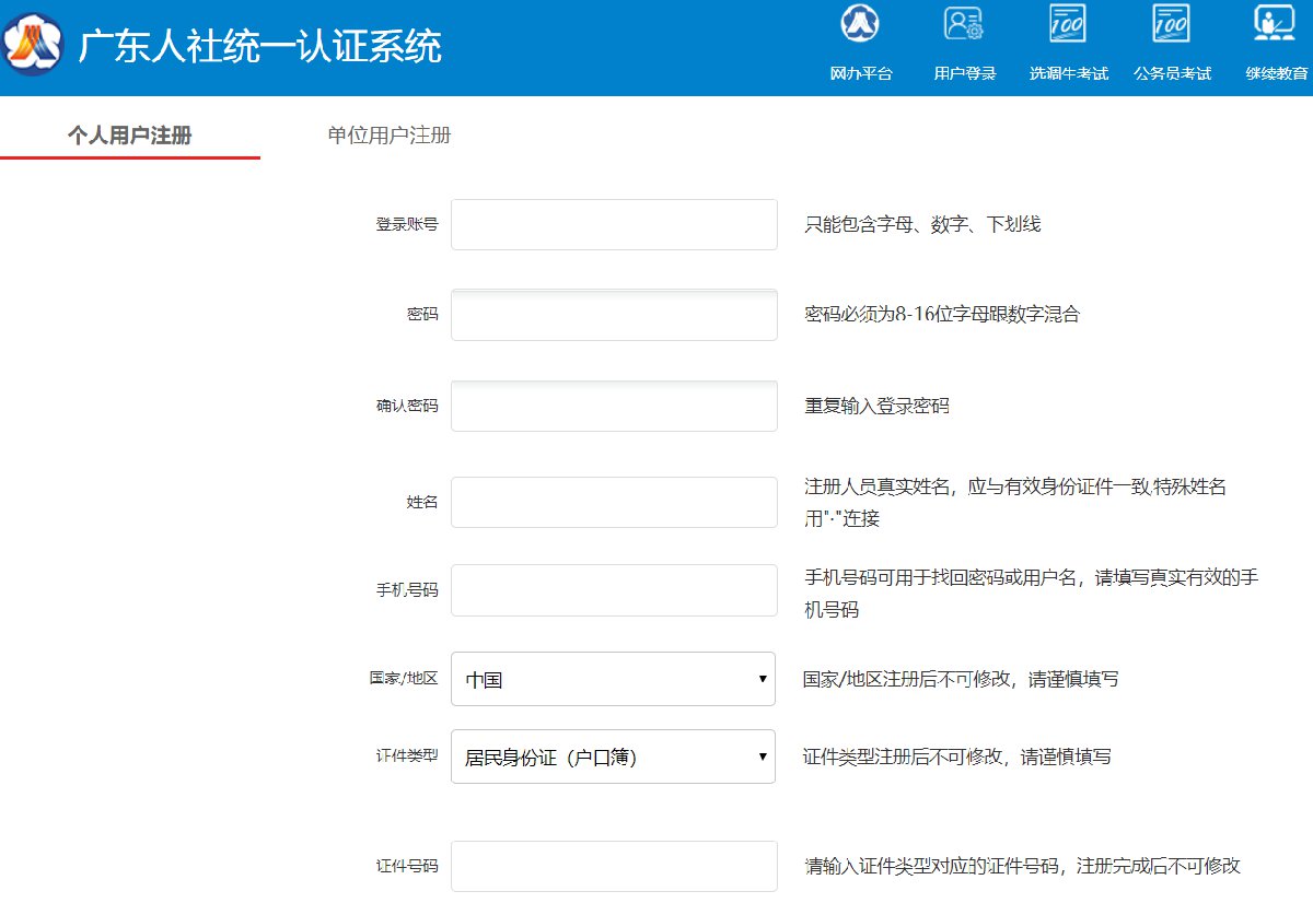 已在广东省人力资源和社会保障厅网上服务平台注册的用户,请使用原用户名、密码登录电子证书系统,无需再次注册;未在该平台注册过的用户,在系统入口请点击注册按钮进入个人用户注册界面,如实填写姓名、证件类型、证件号码、手机号码和邮箱等个人信息后即完成注册。